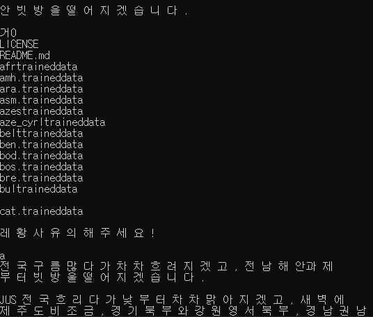 한글 텍스트를 추출하기 위해서 다시 명령어를 입력하면 정상적으로 한글 텍스트를 추출하는 것을 확인할 수 있습니다.