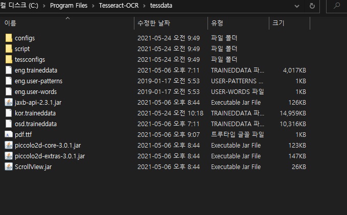 테서랙트(Tesseract) "tessdata" 폴더에 다운로드된 kor 파일을 복사합니다.