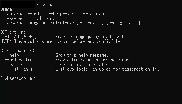 테서랙트(Tesseract) 기본 명령어는 stdout -l를 사용해서 언어를 선택할 수 있습니다.
