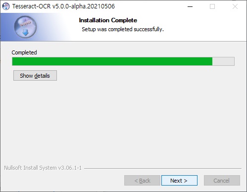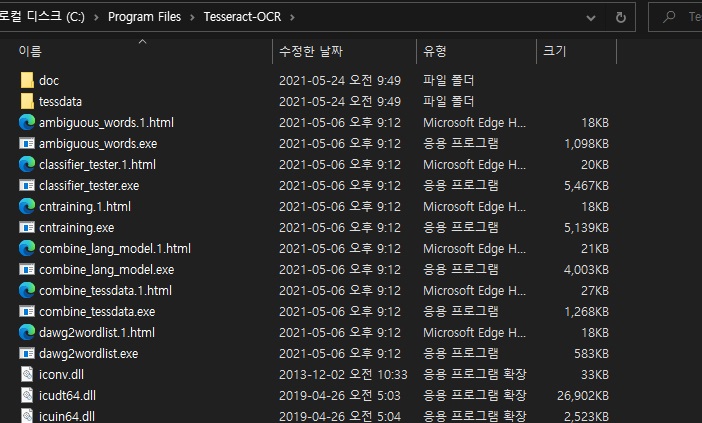 설치 경로는 기본적으로 "Program Files" 아래 "Tesseract-OCR" 폴더에 설치됩니다.