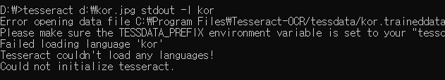 그런데 "Failed loading language 'kor' " 오류가 발생하면서 텍스트 추출이 안됩니다.