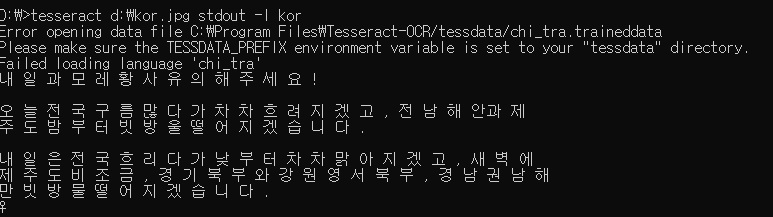 이번에는 한글을 추출하기 위해서 옵션을 "kor"로 변경했습니다.