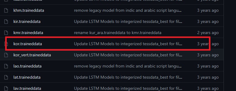아래쪽으로 스크롤하면 "kor.traineddata" 파일을 확인할 수 있습니다.