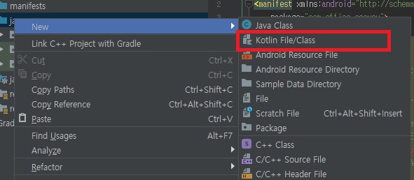 Kotlin File/Class 메뉴를 선택 후