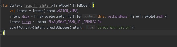 FileUtils.kt파일에 앱을 실행할 수 있는 함수 launchFileIntent를 선언합니다.