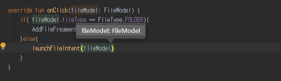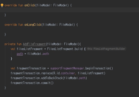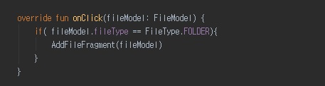 onClick 함수는 폴더일 경우 AddFileFragment를 재 호출하여 리스트를 생성합니다.