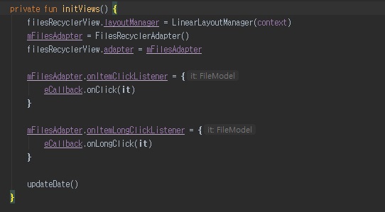 마지막으로 InitViews함수에서 초기화 시점에 mFilesAdapter에 클릭 이벤트를 연동합니다.
