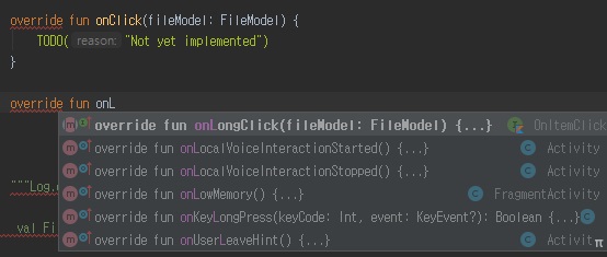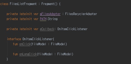 FilesListFragment 클래스는 interface로 onClick, onLongClick를 선언했기 때문에 상속을 받게 되면 interface를 선언해야 오류가 발생하지 않습니다.