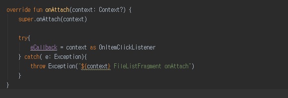 onAttach는 실행 시점에 호출되기 때문에 오류를 방지하기 위해서 catch를 사용해서 오류를 정의합니다.