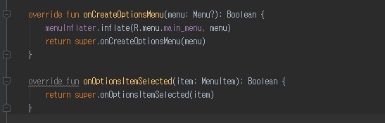 이제 메뉴를 연동하기 위해서 메인 Activity에 onCreateOptionMenu, onOptionsItemSelected 함수를 override 합니다.