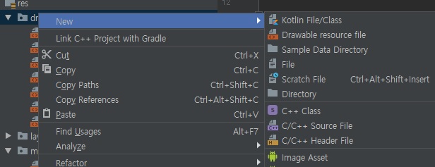 icon 메뉴는 xml 정보를 사용해서 vector로 구성되어 있습니다. 없을 경우 직접 xml을 생성해서 복사 붙여 넣기 해주시면 됩니다.