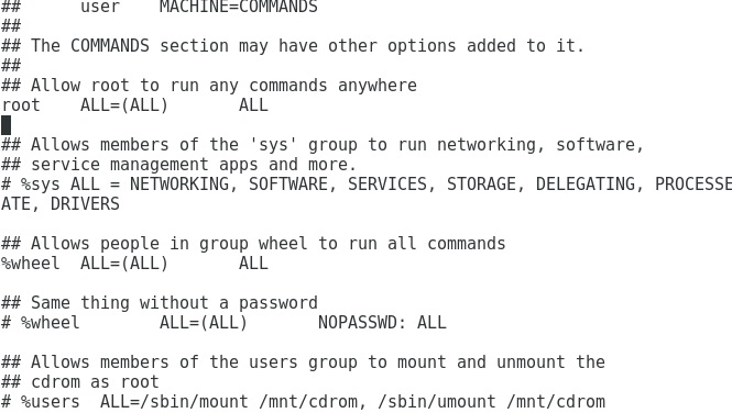 중간에 root ALL=(ALL) ALL 라인을 확인할 수 있습니다.