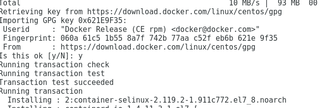 설치 용량을 확인하고 'Y'를 입력하면 docker-ce가 설치됩니다.