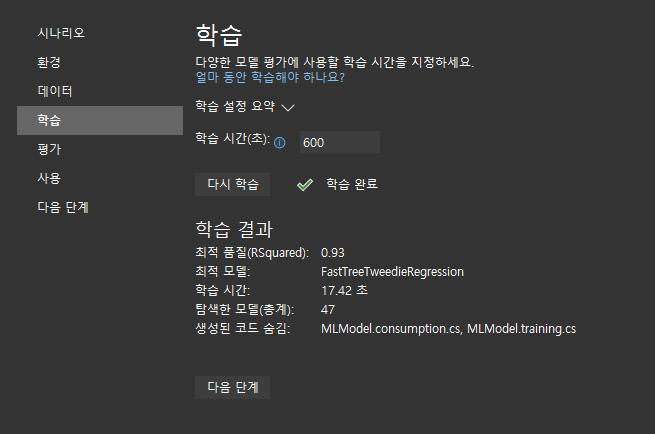 mbconfig 파일을 생성하면 머신러닝 학습을 구성할 수 있습니다. 두 번째 내용인 값 예측을 선택합니다.