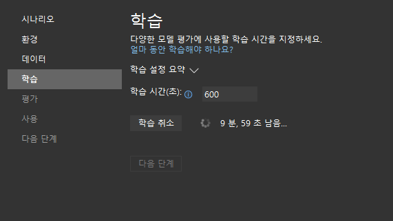 이제 로드된 데이터를 사용해서 학습을 시작합니다. 학습 시간은 10분으로 설정하고 학습 시작 버튼을 클릭합니다.
