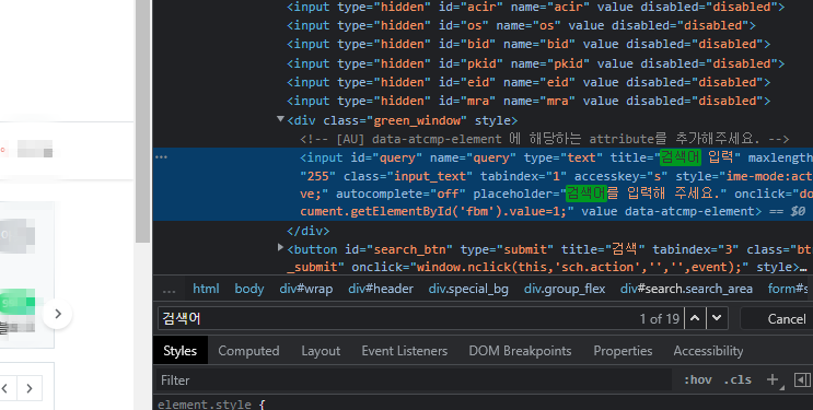 먼저 검색 창 요소를 찾기 위해서 마우스를 이동합니다. 툴팁으로 "검색어 입력"을 확인할 수 있습니다.