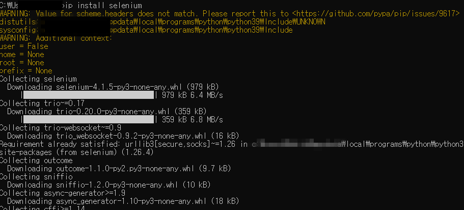 먼저 pip 기능을 사용해서 selenium을 설치합니다. 셀레늄(selenium)을 사용해서 ChromeDriver를 제어할 수 있습니다.