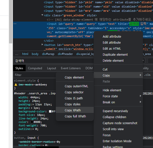 xPath 경로를 확인하기 위해서는 태그를 선택하고 마우스 우크릭에서 "Copy" -> "Copt XPath"를 선택하면 태그 xPath를 확인할 수 있습니다. 검색창 태크 xPath는 "//*[@id='query']"입니다.