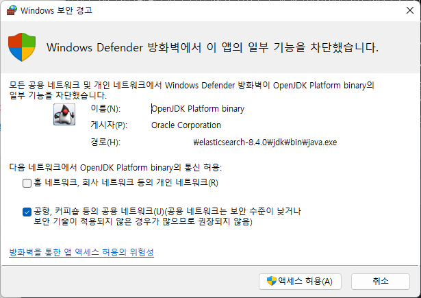 OpenJDK 실행에 따른 액세스 허용을 클릭하고 실행합니다. 정상적으로 실행되었다면, 브라우저를 실행해서 http://localhost:9200을 입력합니다. 엘라스틱서치(Elastic Search)는 기본 포트가 9200으로 설정됩니다.