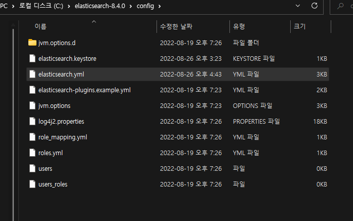 elasticearch-8.4.0 하위 config 폴더로 이동해서 elasticsearch.yml 설정 파일을 오픈합니다. Visual Studo Code가 설치되어 있으면 바로 실행이 가능하고, 설치 안되어 있다면 Notepad를 사용해서 오픈하면 됩니다.