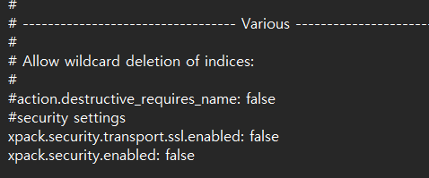 elasticearch.yml파일 맨 아래쪽으로 이동해서 ssl 인증을 비활성화해주는 옵션을 입력합니다.