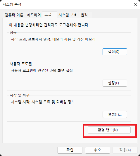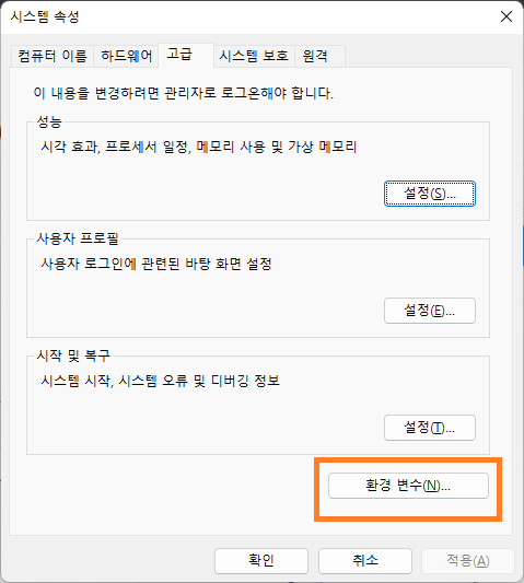 시스템 속성 창이 출력되면 아래쪽에 있는 "환경 변수" 버튼을 클릭합니다.
