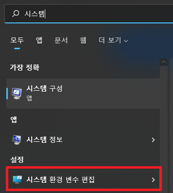 이번에는 Windows11 검색 기능을 사용해서 환경 변수를 등록해보겠습니다. Windows11 하단에 있는 시작 버튼을 클릭하고 위쪽에 있는 검색에서 "시스템"을 입력합니다. 아래쪽에 "시스템 환경 변수 편집"을 확인하고 클릭해주세요.