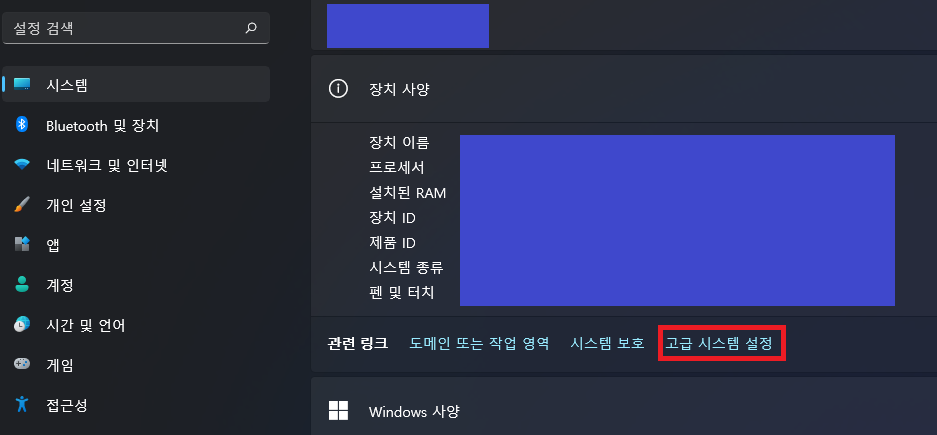 "속성" 메뉴를 선택하면 시스템 정보를 확인할 수 있는 창이 출력됩니다. 장치 사양 아래쪽에 "고급 시스템 설정" 메뉴를 클릭해주세요.