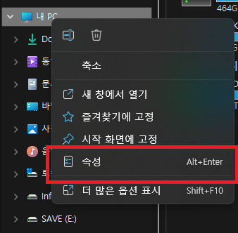 Windows11에서 환경변수를 등록하기 위해서는 다양한 방법이 있습니다. 먼저 기존에 사용하던 방법으로 알아보겠습니다. 탐색기를 사용해서 등록하는 방법으로 내 PC에서 마우스 우클릭을 해주세요. Windows11은 두 가지 메뉴를 확인할 수 있습니다. 하단에 있는 "속성" 메뉴를 선택해주세요.
