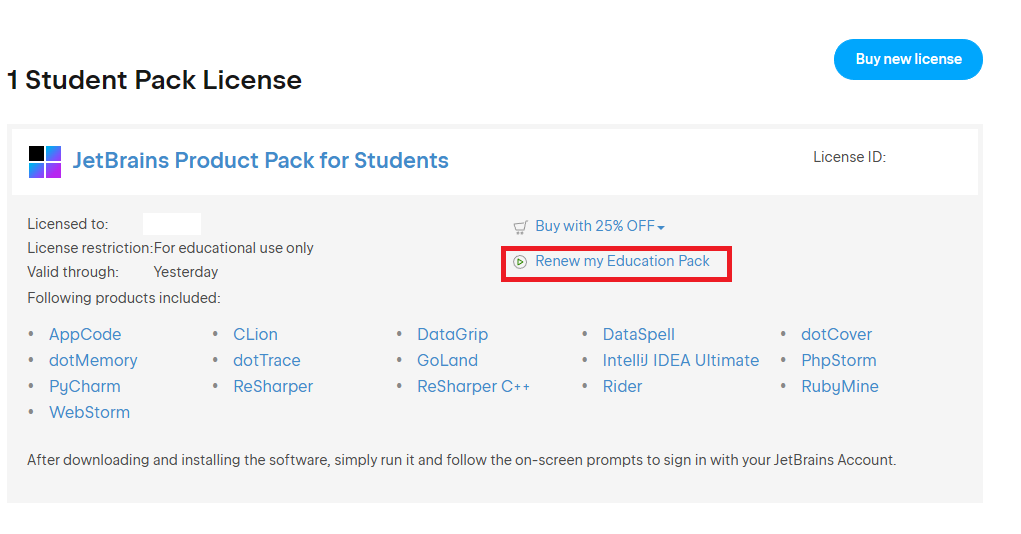 먼저 JetBrains 홈페이지에 로그인해서 라이선스 정보를 확인합니다. vaild through 항목을 확인하니까 사용 기간이 만료되었습니다. 이제 교육용 라이선스 갱신을 하기 위해서 "Renew my Education Pack" 항목을 클릭합니다.