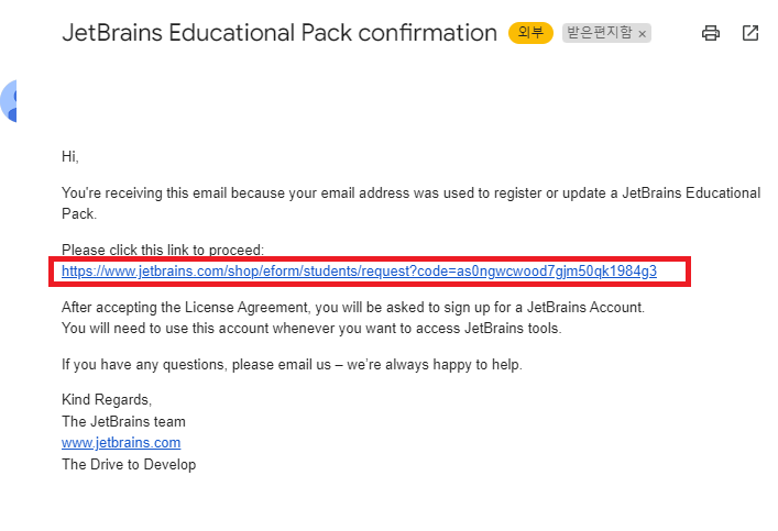 링크를 클릭하면 정상적으로 JetBrains IntelliJ 교육용 라이선스 갱신이 완료됩니다.
