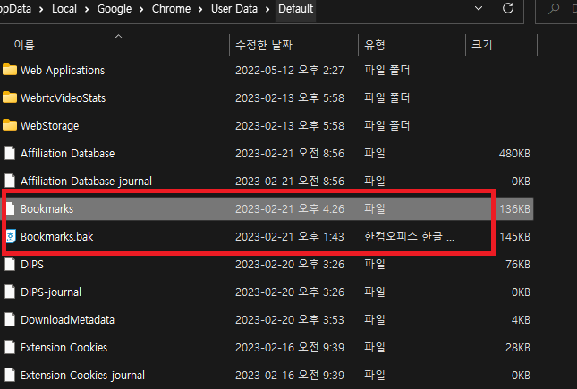 크롬(Chrome) 브라우저는 즐겨찾기(북마크)는 별도 파일로 특정 폴더에 저장됩니다. 파일 위치는 %localdata%를 입력해서 Local\Google\Chrome\User Data\Default 위치로 이동하면 파일 상단에 Bookmarks파일을 확인할 수 있습니다.