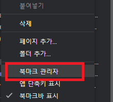 크롬(Chrome)에서 간단하게 북마크를 관리하기 위해서는 즐겨찾기(북마크)에서 마우스 우클릭을 사용해서 "북마크 관리자" 메뉴를 클릭합니다.