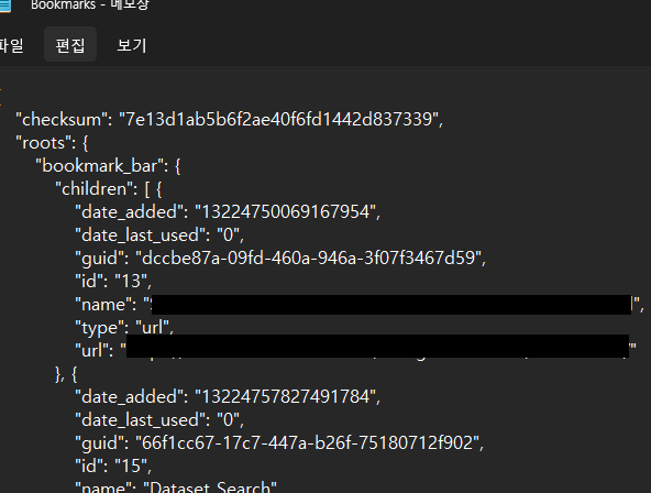 Bookmarks 파일을 오픈하면 node 형태로 즐겨찾기 사이트 정보를 확인할 수 있습니다. Bookmarks 파일을 동기화를 통해서 저장되거나 별도 백업으로 관리 가능합니다. 즐겨찾기(북마크) 정보를 별도 파일로 저장하고 싶다면 Bookmarks 파일을 복사해서 저장하면 됩니다.