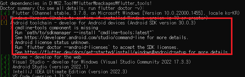 녹색으로 체크되면 정상이고 빨간색은 오류입니다. 오류 내용을 확인하면 설치 확인 시 Android SDK licenses 동의가 필요하다고 합니다. 친절하게 'flutter doctor --android-licenses'를 입력하라고 합니다. 그런데 입력하면 오류가 발생합니다. 이를 해결하기 위해서 Android studio에서 Tool을 설치가 필요합니다.