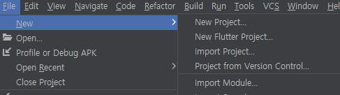 정상적으로 설치되었다면, File 메뉴에서 'New Flutter Project' 메뉴를 확인할 수 있습니다.