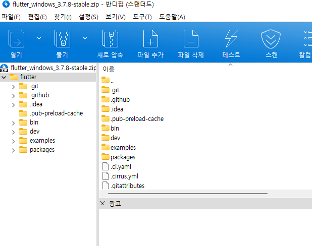 이제 가장 중요한 플러터(Flutter)를 설치해야 합니다. Flutter SDK 사이트에 방문해서 최신 버전을 다운로드합니다. 다운로드 시 바이러스로 인식하는 문제가 있지만, 전 그냥 해제하고 다운로드했습니다. 정상적으로 다운로드되었다면, 압축을 해제합니다.