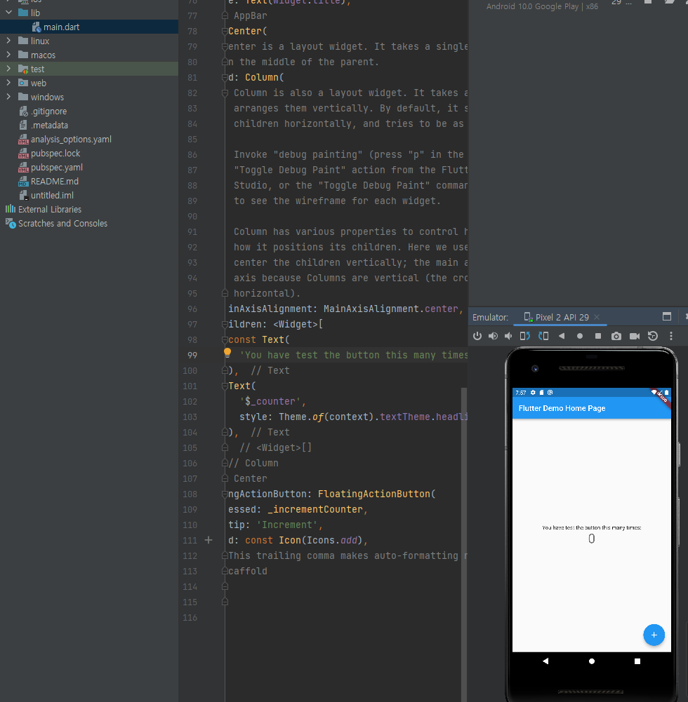 정상적으로 설치되었다면 Project가 생성되고, IOS, Android, Windows 항목을 확인할 수 있습니다. 플러터(Flutter)는 lib 폴더 아래에 있는 main.dart 파일로 실행할 수 있습니다. const Text 항목을 변경하고 실행하면 'Flutter Demo Home Page' 앱 화면을 확인할 수 있습니다. 감사합니다.