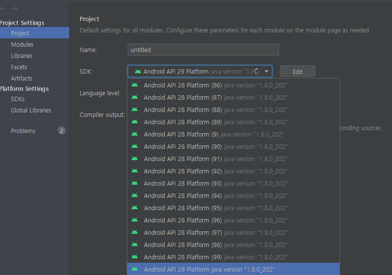 Project 항목에서 SDK를 선택합니다. ADB에 설정된 SDK를 선택하고 저장을 클릭합니다. 정상적이라면 플러터(Flutter) 컴파일이 실행됩니다. 그런데 안 되는 경우가 있습니다.