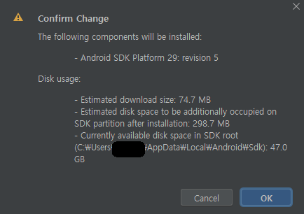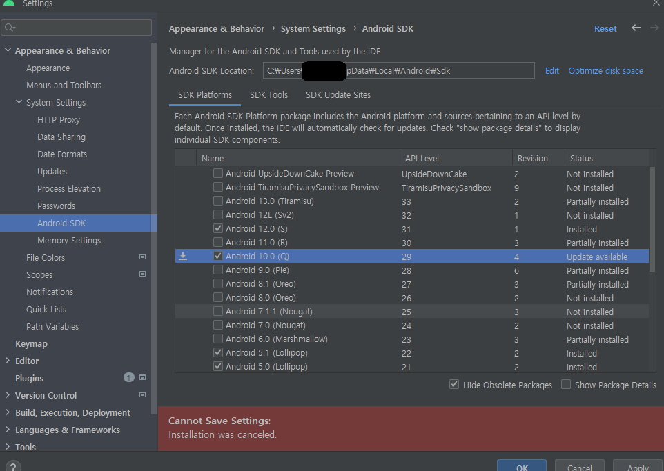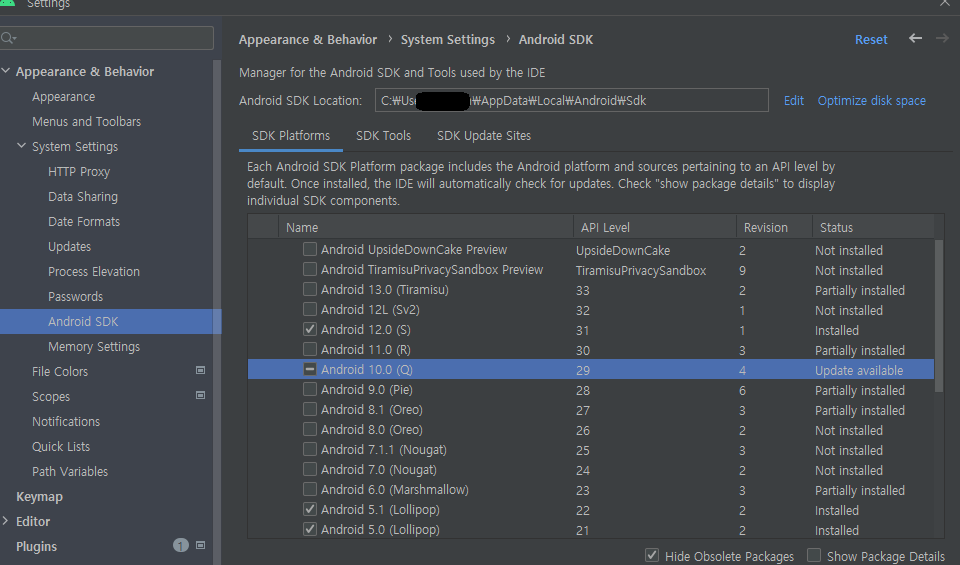 'setting' 메뉴에서 Android SDK 항목을 선택하면 선택한 SDK 업데이트가 필요한 경우가 있습니다. SDK 확인하면, 체크가 아닌 업데이트(Update Available)로 변경되어 있습니다.
