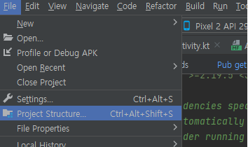 먼저 SDK 설정을 확인해 보겠습니다. File에서 'Project Structure'를 선택합니다.