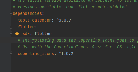 Project에서 pubspec.yaml파일로 이동 후 dependencies 항목 아래쪽에 'table_calendar: ^3.0.9'을 입력합니다. 처음 설치 시 확인된 버전을 입력하면 됩니다.