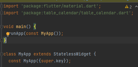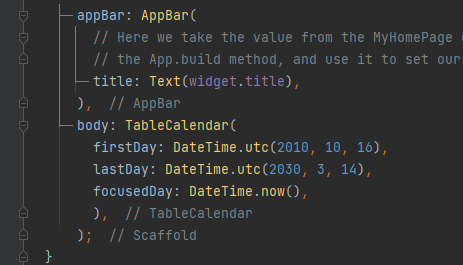 main.dart 파일로 이동 후 하단에 있는 build 함수에 TableCalendar을 선언합니다.