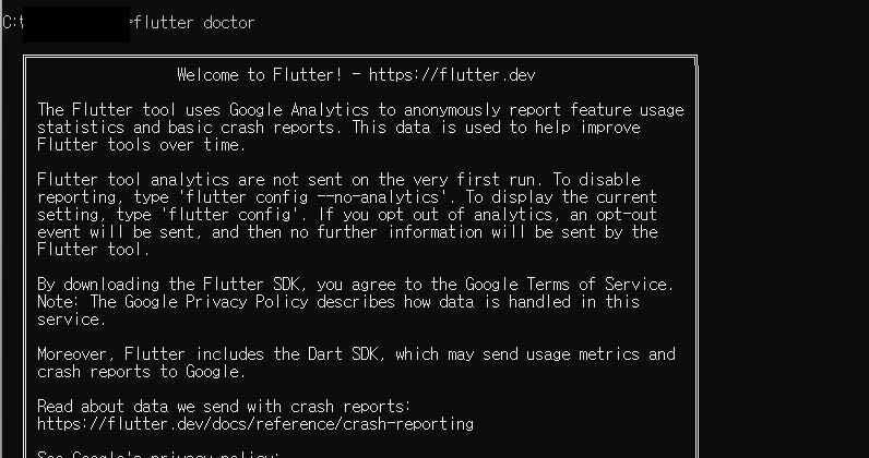 환경설정이 정상적으로 등록되었다면, 'flutter doctor' 명령어로 설치 상태를 확인할 수 있습니다.