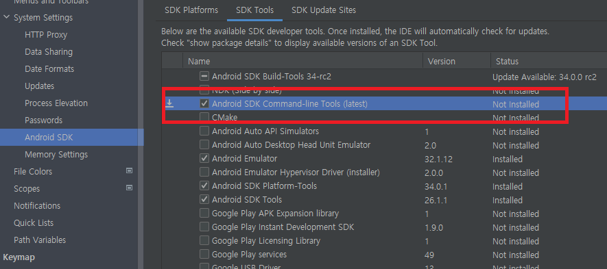 하위 항목에서 Android SDK 메뉴를 선택하고 SDK Tools 탭으로 이동 후 하단에 있는 "Android SDK Command-line Tools"를 체크하고 설치합니다. 정상적으로 설치되었다면 라이선스 동의 명령어 'flutter doctor --android-licenses' 입력하고 확인하면 정상적으로 모두 녹색으로 체크됩니다. 이제 Android Studio에서 Flutter Plugin 설치가 필요합니다.