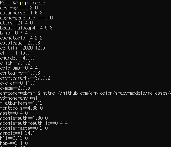 freeze 명령어를 사용하면 package 이름과 버전이 한번에 출력됩니다. 가독성은 조금 떨어지지만, package 버전은 한눈에 들어옵니다. package 모듈에 대한 상세한 정보를 알고 싶다면 show 명령어를 사용하면 됩니다.