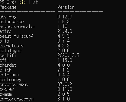pip list를 사용하면 Package, Version을 정렬하여 확인 가능합니다. 일반적인 리스트 형태로 보고 싶다면 freeze 명령어를 사용하면 됩니다.