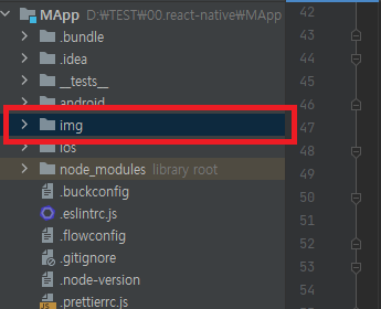 두 번째 방법은 직접 Image 리소스를 사용하는 방법입니다. 먼저 Project 아래에 img 폴더를 생성합니다. 리액트 네이티브(React Native)는 다양한 디바이스에 앱을 구성하므로, 항상 공통 폴더를 사용해서 접근하는 게 편리합니다. 리소스에 사용할 이미지를 img 폴더에 복사합니다.