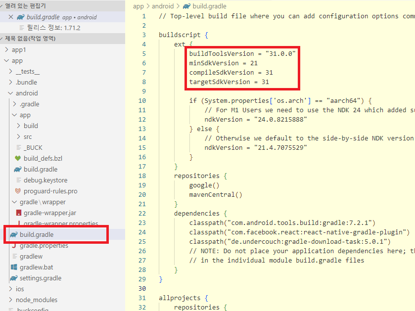 android 폴더 하단에 있는 build.gradle 파일을 오픈해서 android 실행 버전을 확인합니다. buildToolsVersion 버전이 31 버전으로 실행되는 것을 확인할 수 있습니다. Visual Studio Code를 사용하면 쉽게 코드를 수정할 수 있어 매우 편리합니다. 가장 좋은 점은 iOS에서도 사용이 가능하고 다양한 plug in을 사용할 수 있습니다. 이제 버전을 확인했으니, android SDK를 설치해야 합니다.