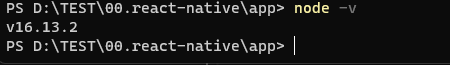 react-native는 javascript를 사용하므로, javascript의 런타임 Nodejs를 설치해야 합니다. 기본적으로 개발환경이 구성되어 있다면 간단하게 버전 확인 후 설치 안되어 있다면 choco 명령어를 사용해서 설치합니다.